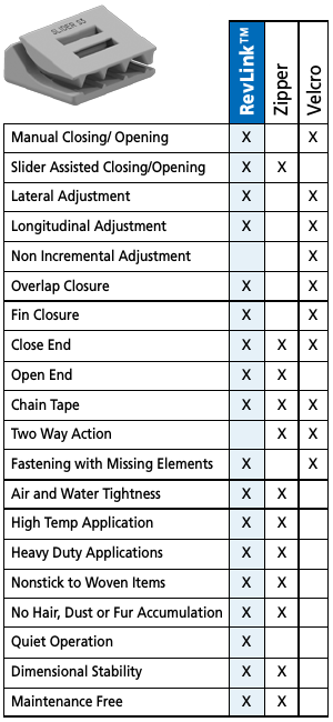 RevLinkTM is a perfect replacement option for current fastening devices – primarily the Zipper and Hook & Loop (Velcro).